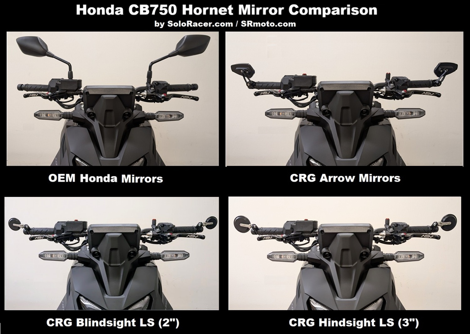 What are the best aftermarket mirrors for the Honda CB750 Hornet? Keep reading.... The stock mirrors are one of the very first things we usually replace on our project bikes, for a couple reasons. Normally they do not look that great, and a lot of times they don't provide the best visibility. This was exactly the case with our Honda CB750 Hornet project bike, and we definitely wanted to replace the stock mirrors not only for the better look, but also improved functionality and visibility. On previous builds we've used a combination of Rhino Moto bar end slider / mirror mounts along with CRG Bar End mirrors. You simply can't go wrong with products from these two companies, and we probably have their products on 4 or 5 of our builds.