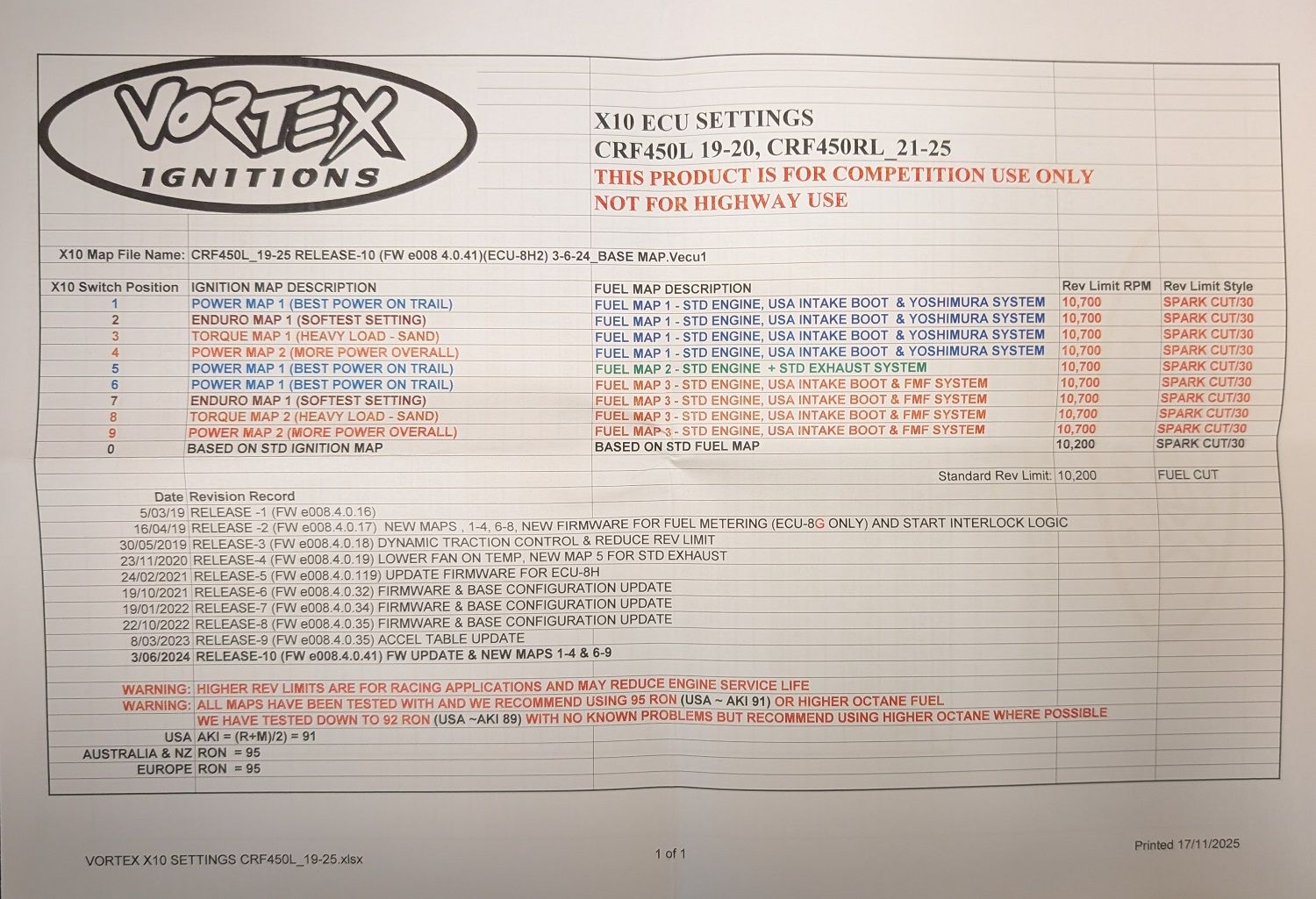 Map List: Honda CRF450RL Vortex ECU Map List