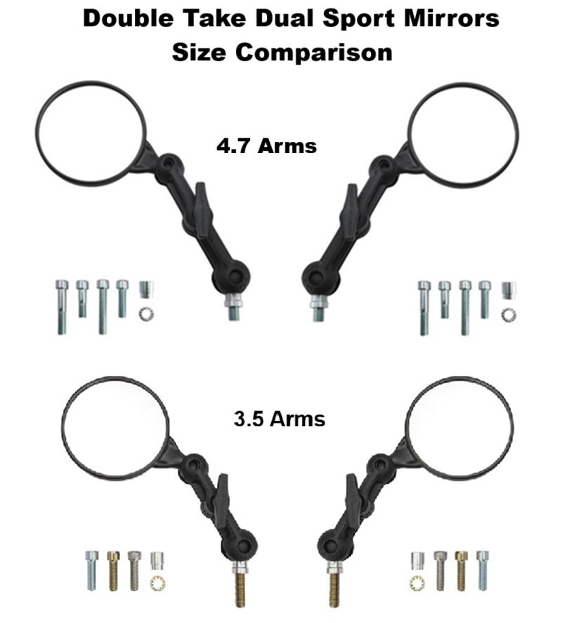 ** NOTE: After many customer requests, we now carry these DT Dual Sport mirrors with either the 3.5 inch or 4.7 inch long mirror mounting arm. The 4.7 seems to be the most popular, although some riders prefer the lower profile and shorter 3.5 inch arms. Many of our product photos will show the 3.5 inch arms, since that's what we originally had on our project bikes. Click to see: Size comparison DoubleTake Dual Sport Mirrors.