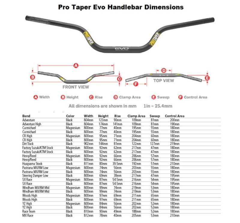 Pro Taper EVO Handlebar Dimension Chart (opens in new window)