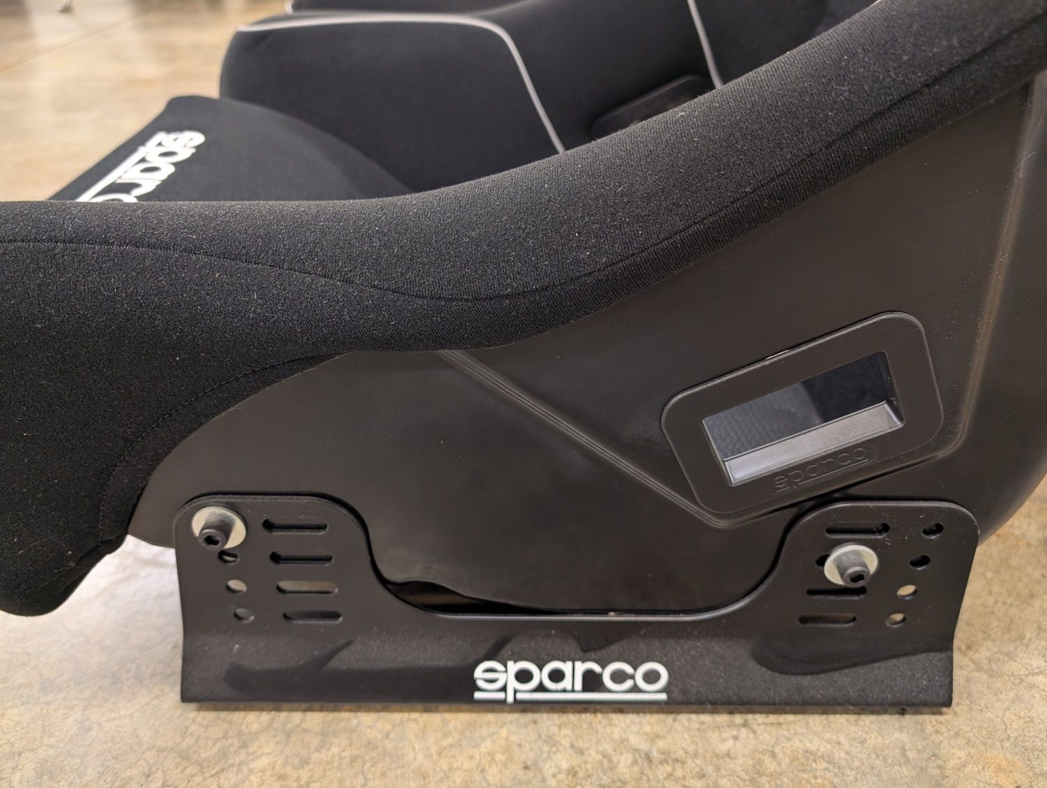 We have two sets of Sparco side mounts (steel version, not aluminum) available, brand new. Seat mounting hardware included. (click for photo)
