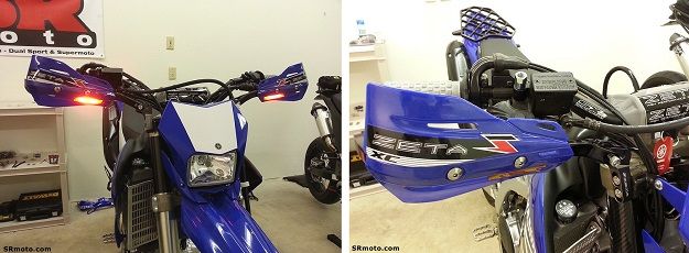 Another popular way to replace the stock WR250R/X turn signals is to purchase a set of Zeta Armor Handguards along with the Zeta XC Flasher Protectors (click photos above). This trick little setup integrates a pair of turn signals/flashers into the plastic part of the hand guards. To get the new LED turn signals/flashers in the XC Protectors to operate as running lights AND to flash at the slow stock flash rate, see the section labeled "Other Products To Consider" at the bottom of this page.