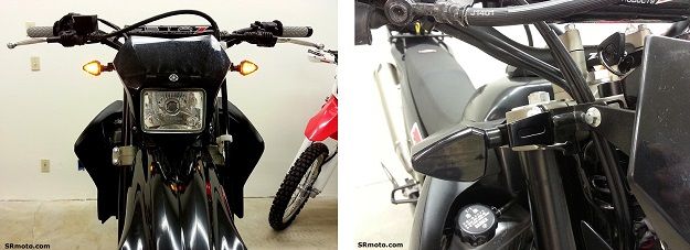One of the more popular ways to get rid of the huge stock front turn signals on the WR250R/X is to replace them with a pair of DRC Type 601 or Type 602 turn signals/flashers, using DRC Front Turn Signal Brackets to attach them to the upper fork triple clamp bolts (click photos above). To get the new LED turn signals/flashers to operate as running lights AND to flash at the slow stock flash rate, see the section labeled "Other Products To Consider" at the bottom of this page.