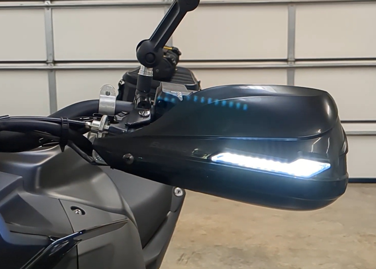 What you get in this used kit is exactly what we had installed on our Honda Transalp XL750 Project Bike. Installation of the handguards themselves is pretty simple since they are designed specifically for the stock handlebars on the Transalp XL750. The Storm plastic protectors screw to the front of the aluminum handguard frames. These will have the Barkbusters LED running lights pre-installed in them, and the wiring is configured the way we had it wired on our project bike so that these LED's would operate as running lights. To power the LED's you have to find an ignition switched power source to wire the LED's to... this will vary from bike to bike, and on the Transalp we found a wired plug up under the TFT dash that is used to connect the Honda Accessory 12V Socket (Honda Part #: 08U71-MKK-D00) that installs on the left side of the dash by the TFT display. We used posi tap connectors to tap into the wire and get power to the LED's. This wired plug we tapped into does not have power to it, unless you also install Honda Accessory 12V Fused Socket Harness (Honda Part #: 08E70-MLC-A00) which plugs in up under the seat, and we include this harness with the handguards. That simply plugs in up under the seat, and then that wired plug up under the TFT dash will have power to it, and can illuminate the LED's.