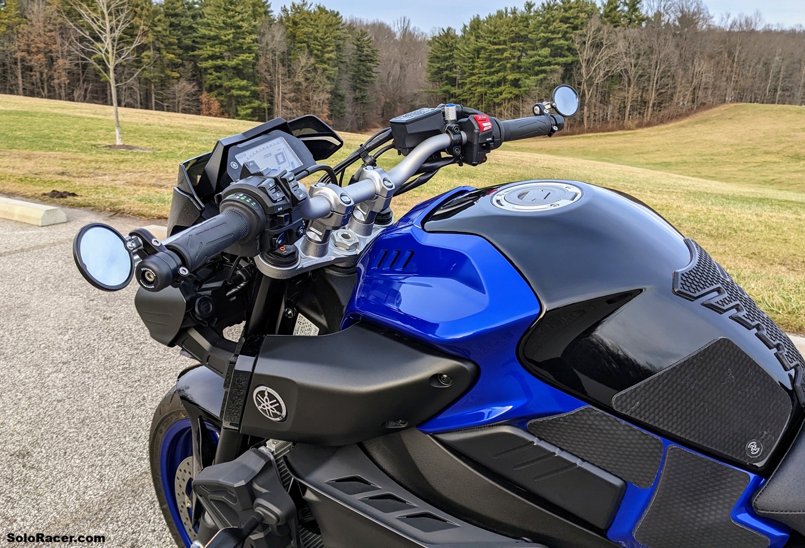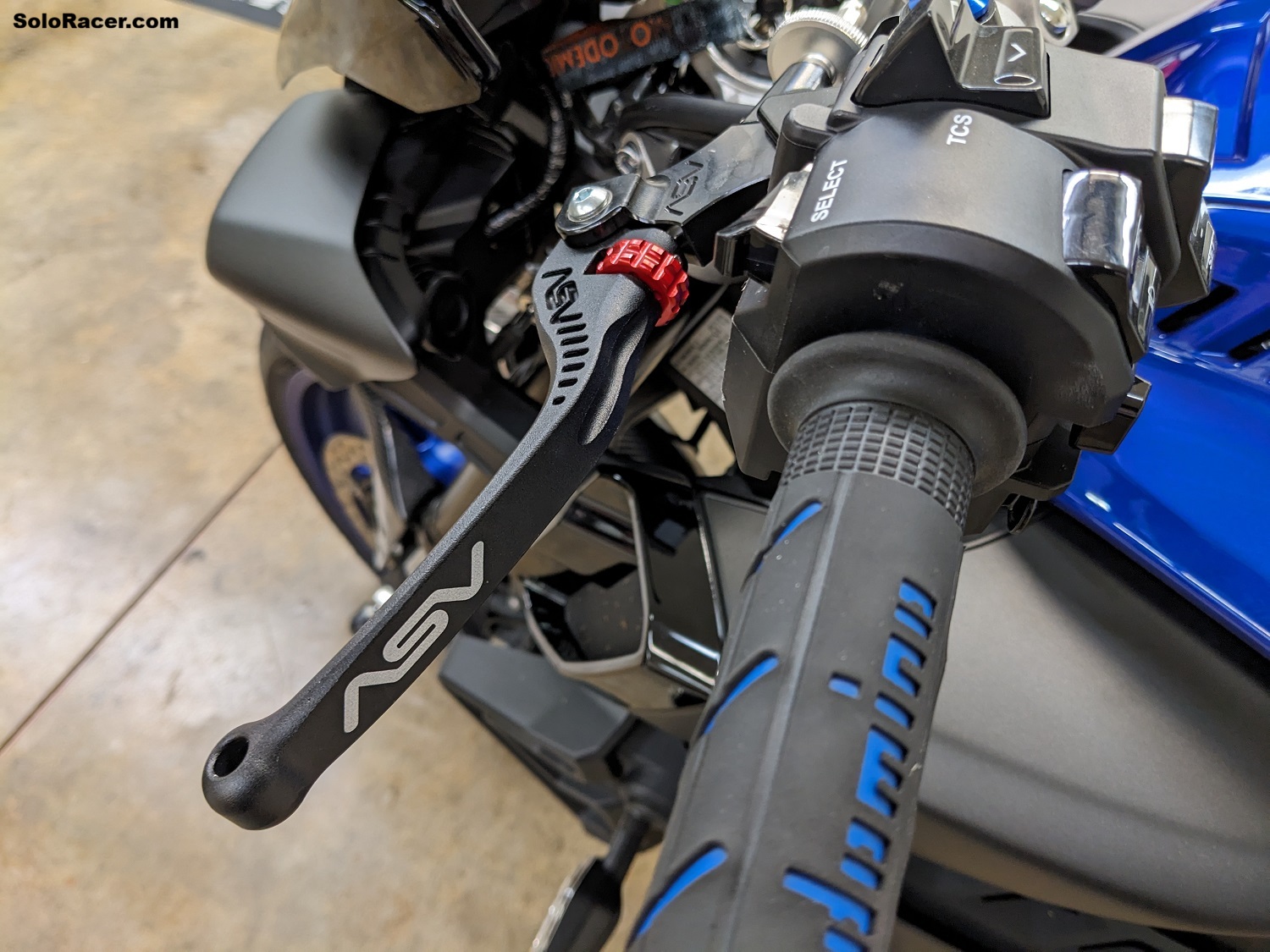 The bike still had the fugly stock mirrors when we got it, so we immediately pulled those and went with our tried and true CRG Blindsight Mirrors with the Rhino bar end sliders w/mirror mounts. This setup works perfectly on these bikes, and the Rhino bar ends thread right into the ends of the stock Yamaha handlebars. We also did ASV Levers, which I'm a big fan of. Be careful on these though, the Shorty version is a very short 2 finger design, so I tend to only use them on the brake side and do the standard 3 finger on the clutch side because I prefer a bit longer lever there.